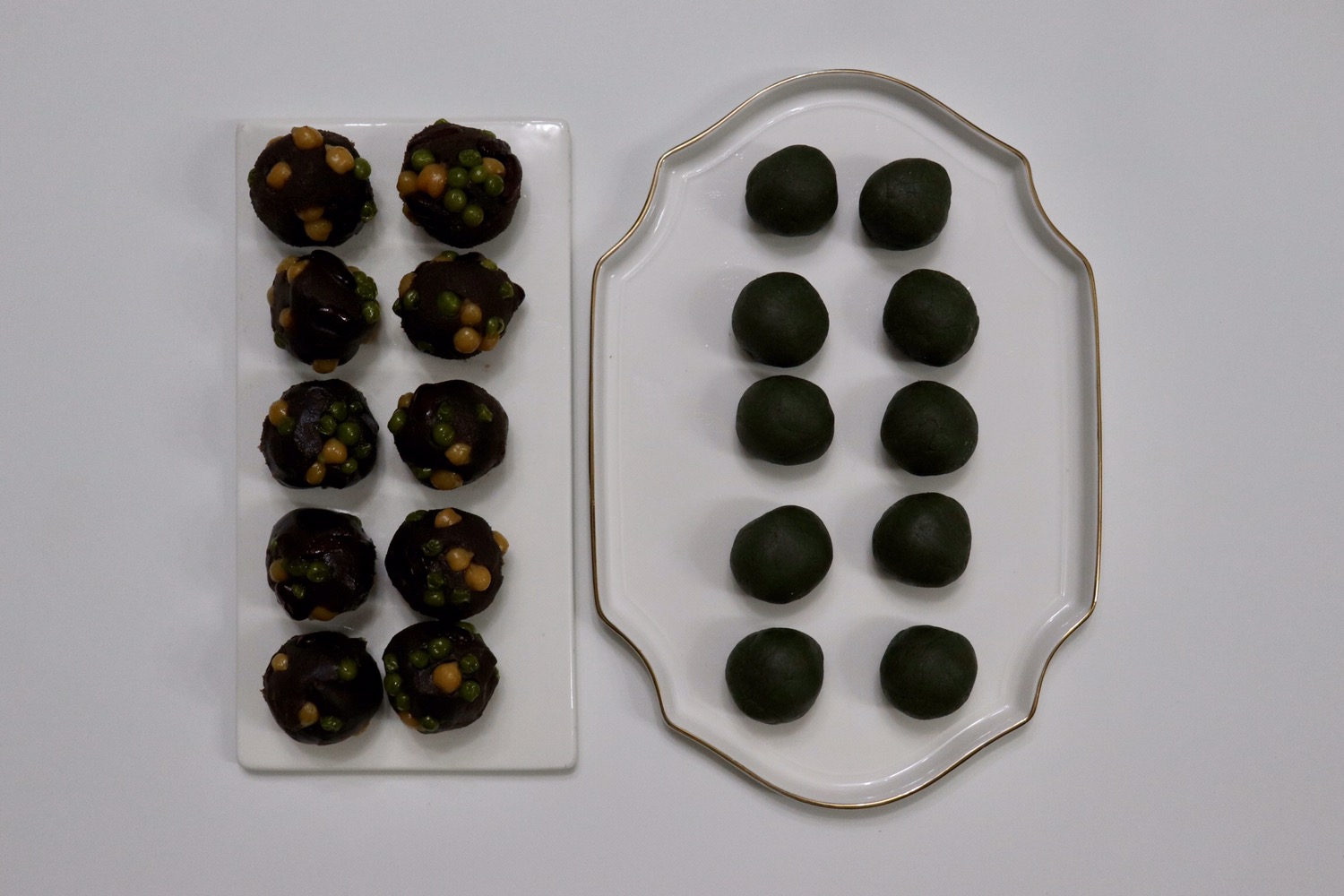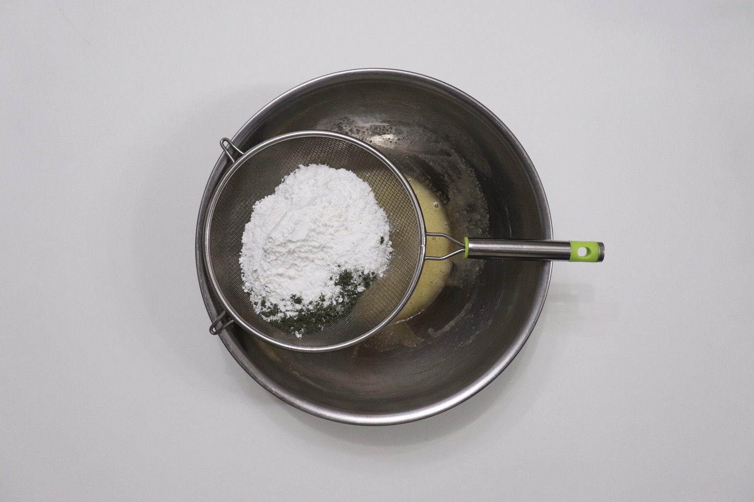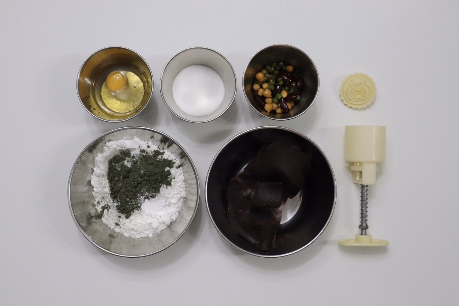 # 재료 : 식용유 15g, 올리고당 10g, 달걀 60g, 설탕 50g, 소금 한 꼬집, 쌀 박력분 150g, 쑥가루 10g, 베이킹소다 2g, 베이킹파우더 1g, 팥앙금 400g, 강낭콩, 완두콩, 병아리콩, 두유나 우유