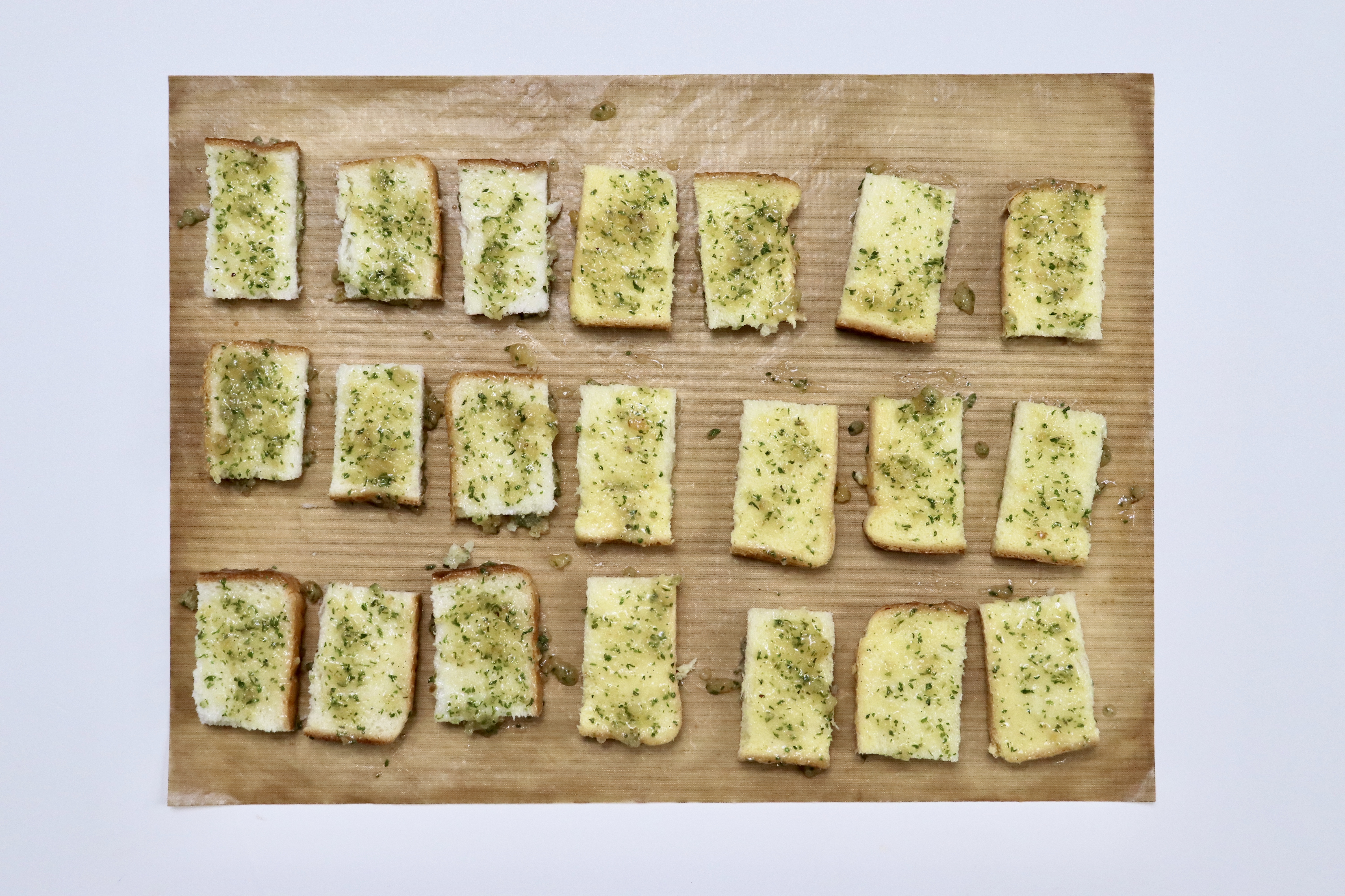 # 재료 : 식빵 5장, 버터 80g, 설탕 70g, 다진마늘 70g, 파슬리가루 한 숟가락, 소금 3g