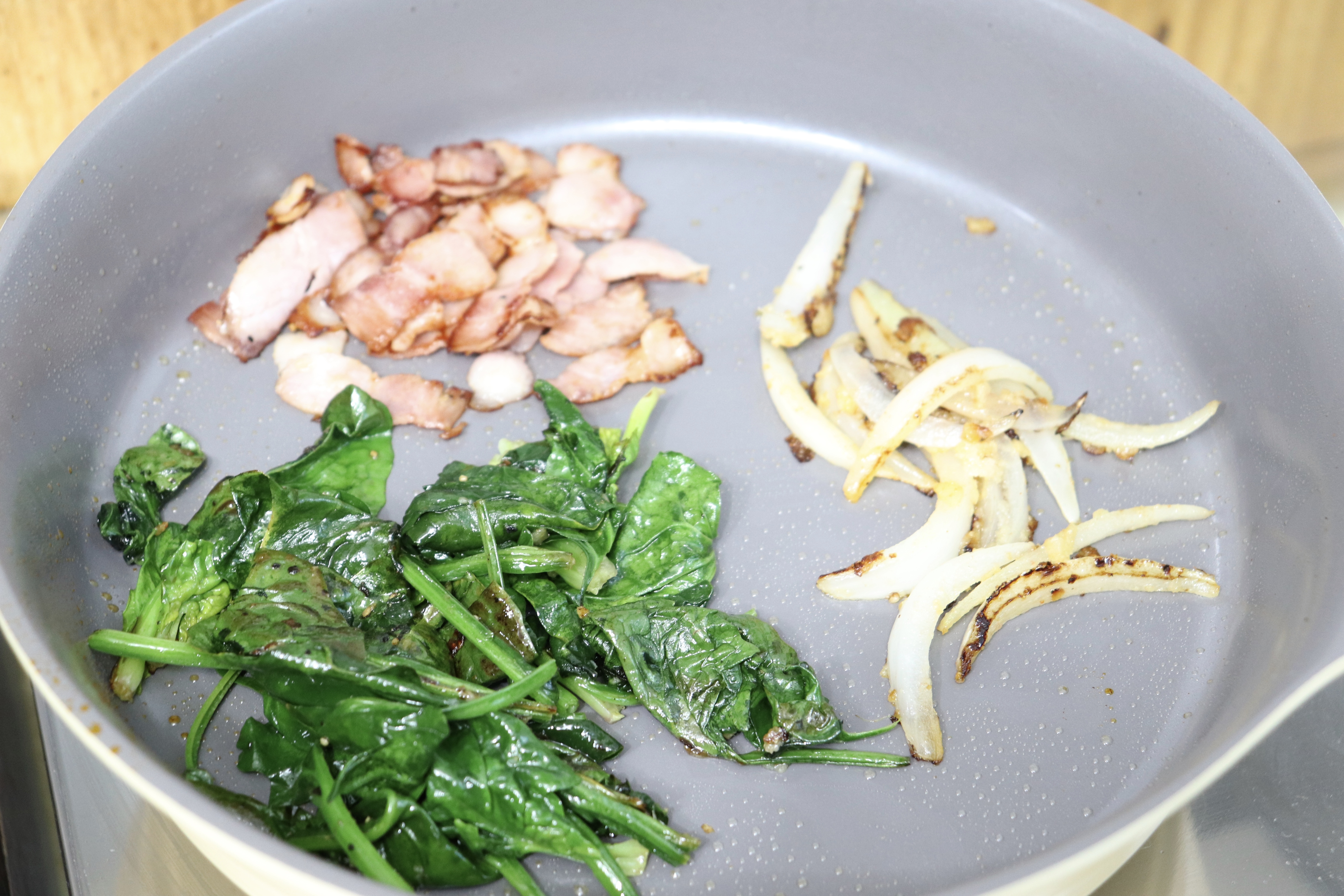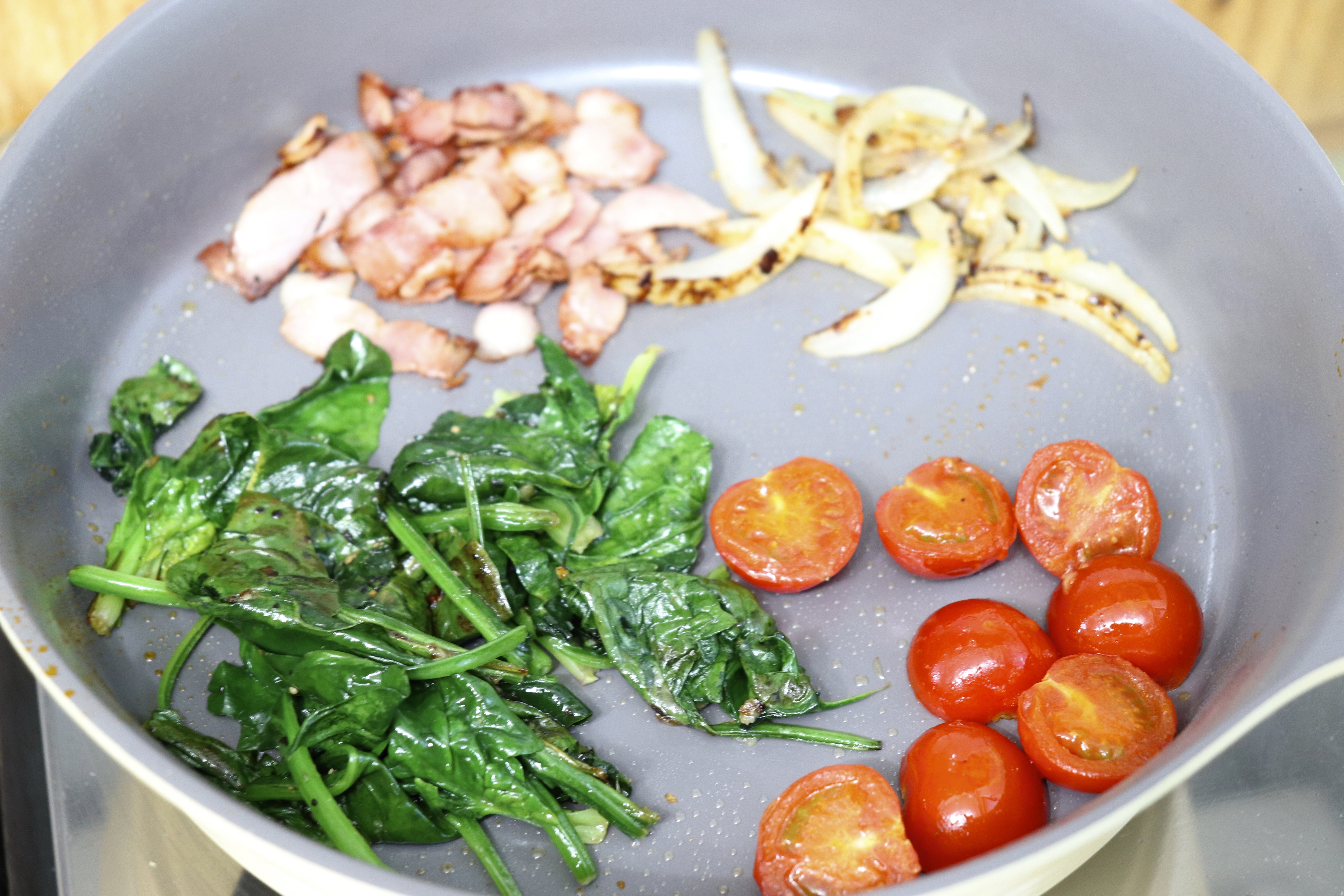 # 재료 : 다진 마늘 4g, 양파 40g, 베이컨 40g, 시금치 40g, 방울토마토 4개, 달걀 4개, 우유 40ml