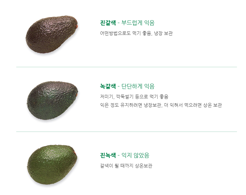 아보카도는 냉장고에 보관을 하며, 먹을 만큼 실온에 꺼내 후숙을 하면 되는데요. 아래 이미지를 참고하셔서 후숙을 하시면 도움이 될 것 같습니다.