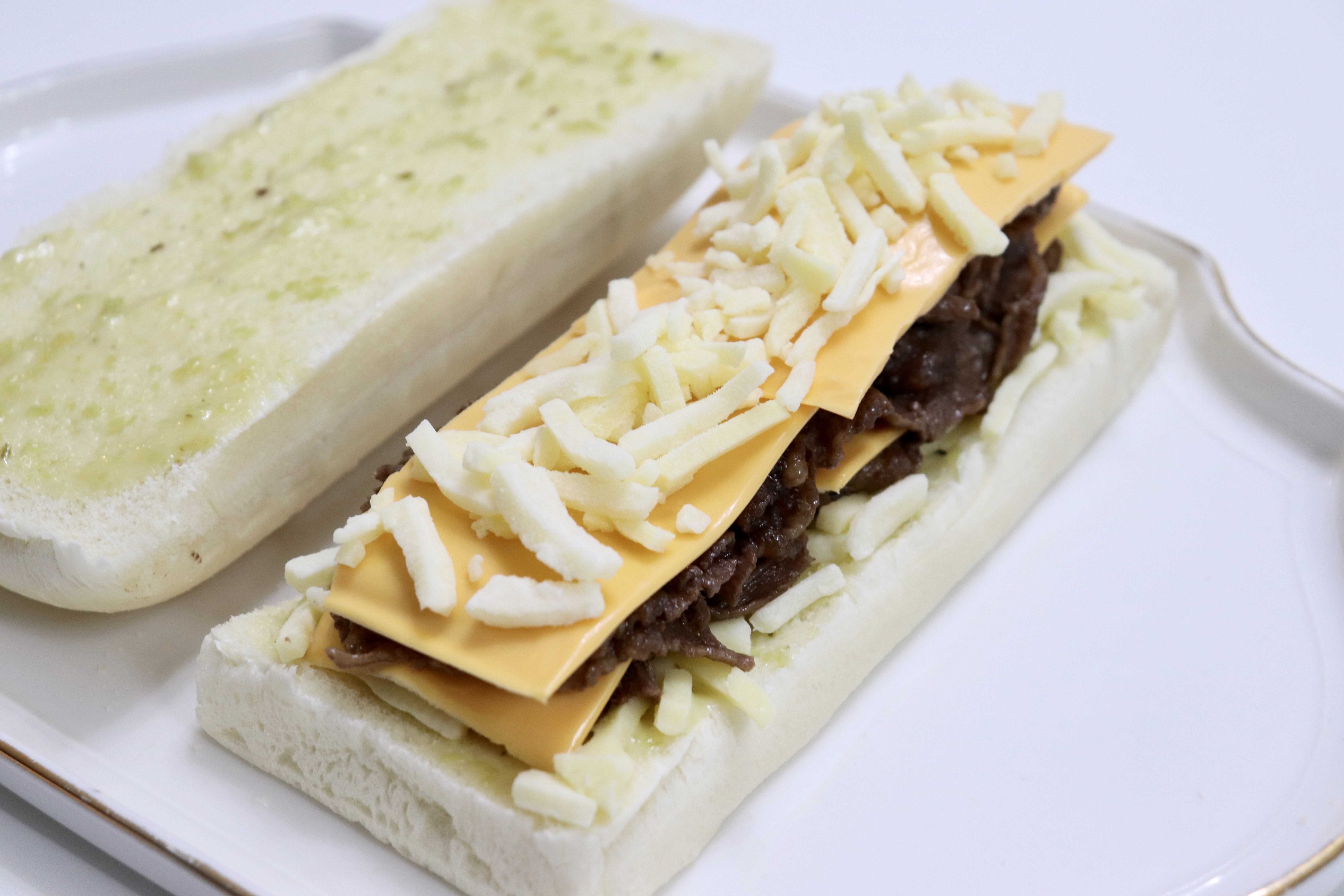 # 재료 : 치아바타 3개, 소고기 350g, 슬라이스 체더치즈 5장, 모차렐라 치즈 100g,