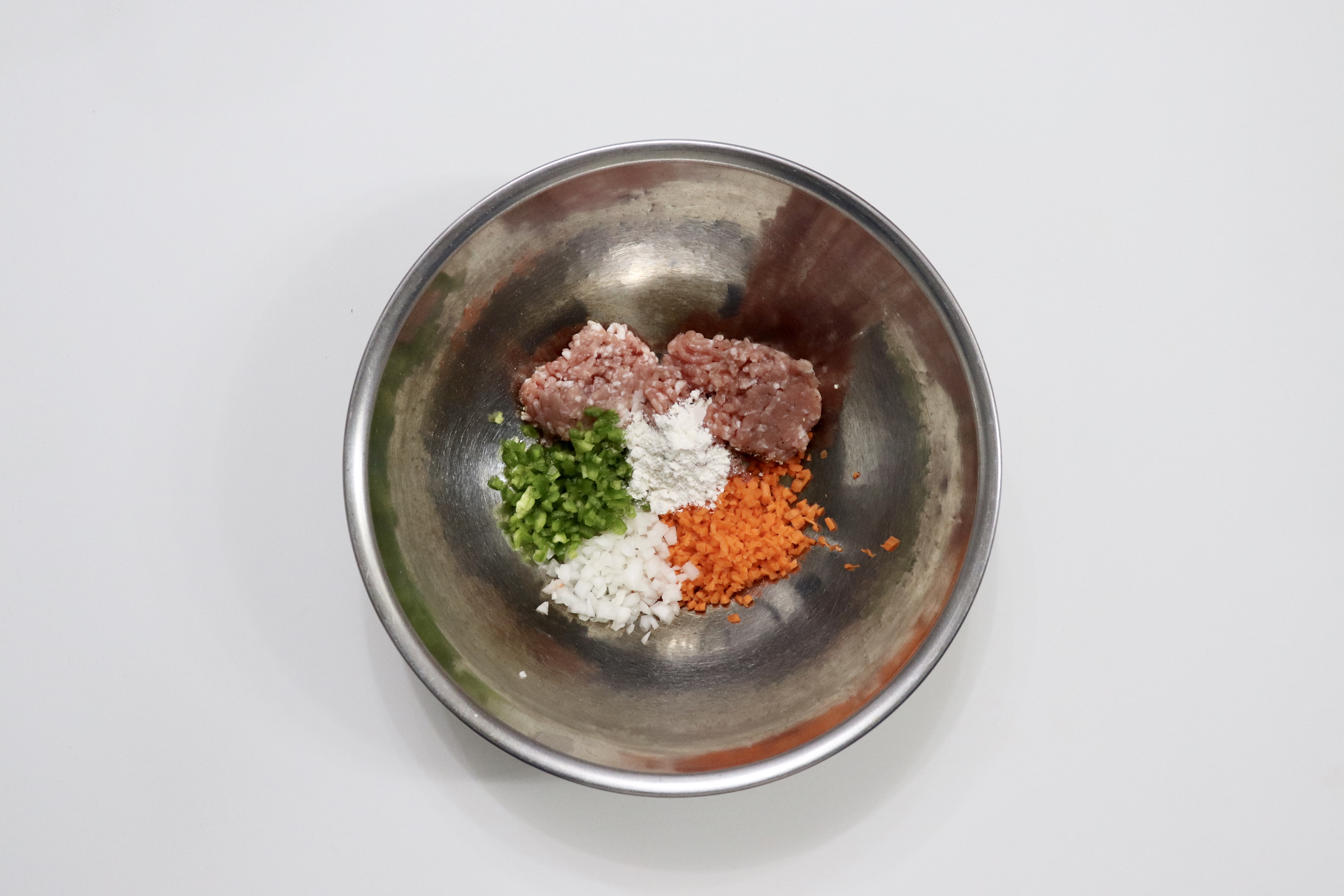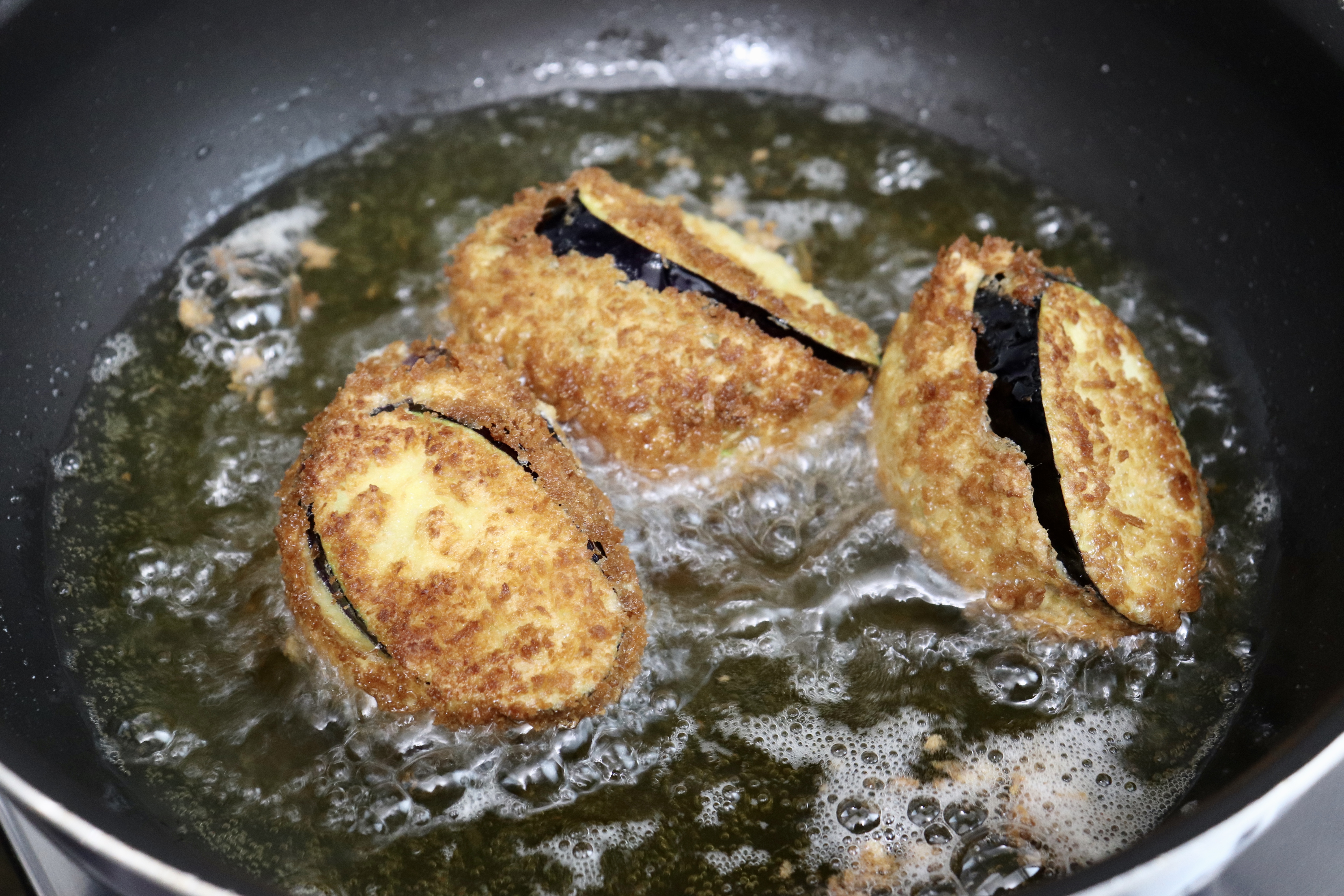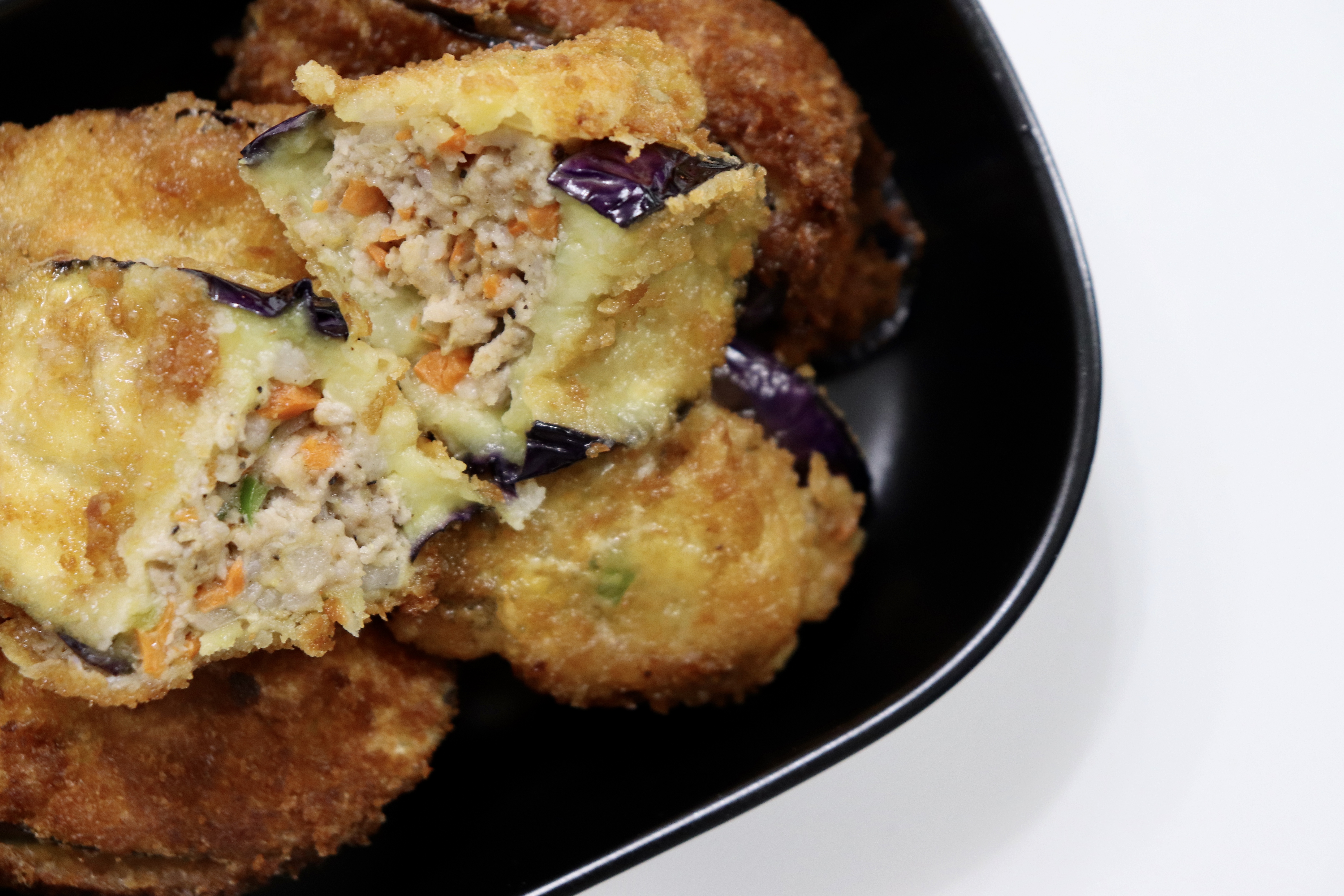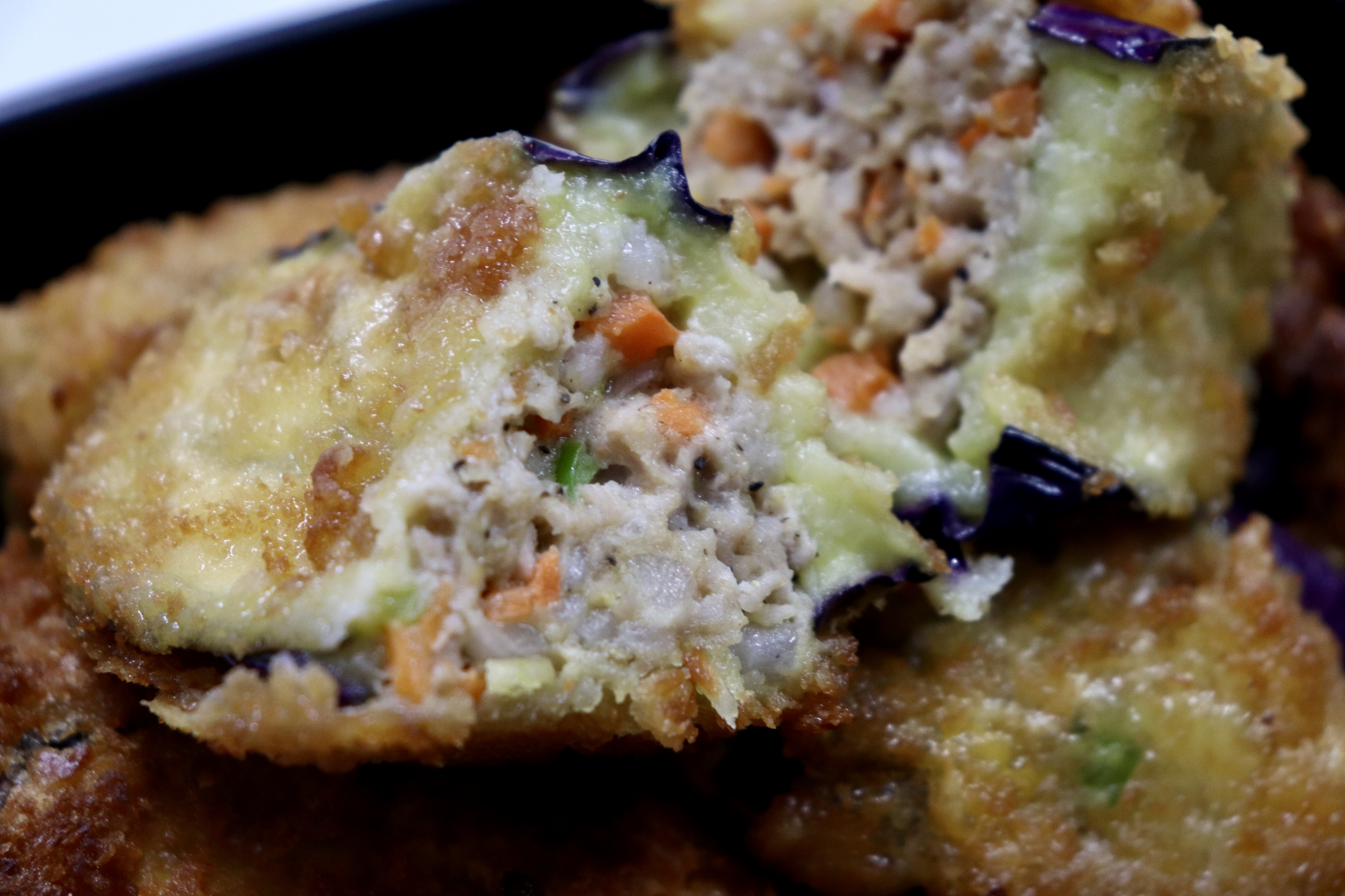 # 재료 : 가지 1개, 다진 고기 150g, 다진 당근 25g, 다진 피망 25g, 다진 양파 25g, 부침가루 1 숟갈, 소금, 후추, 부침가루, 달걀 1개, 튀김가루
