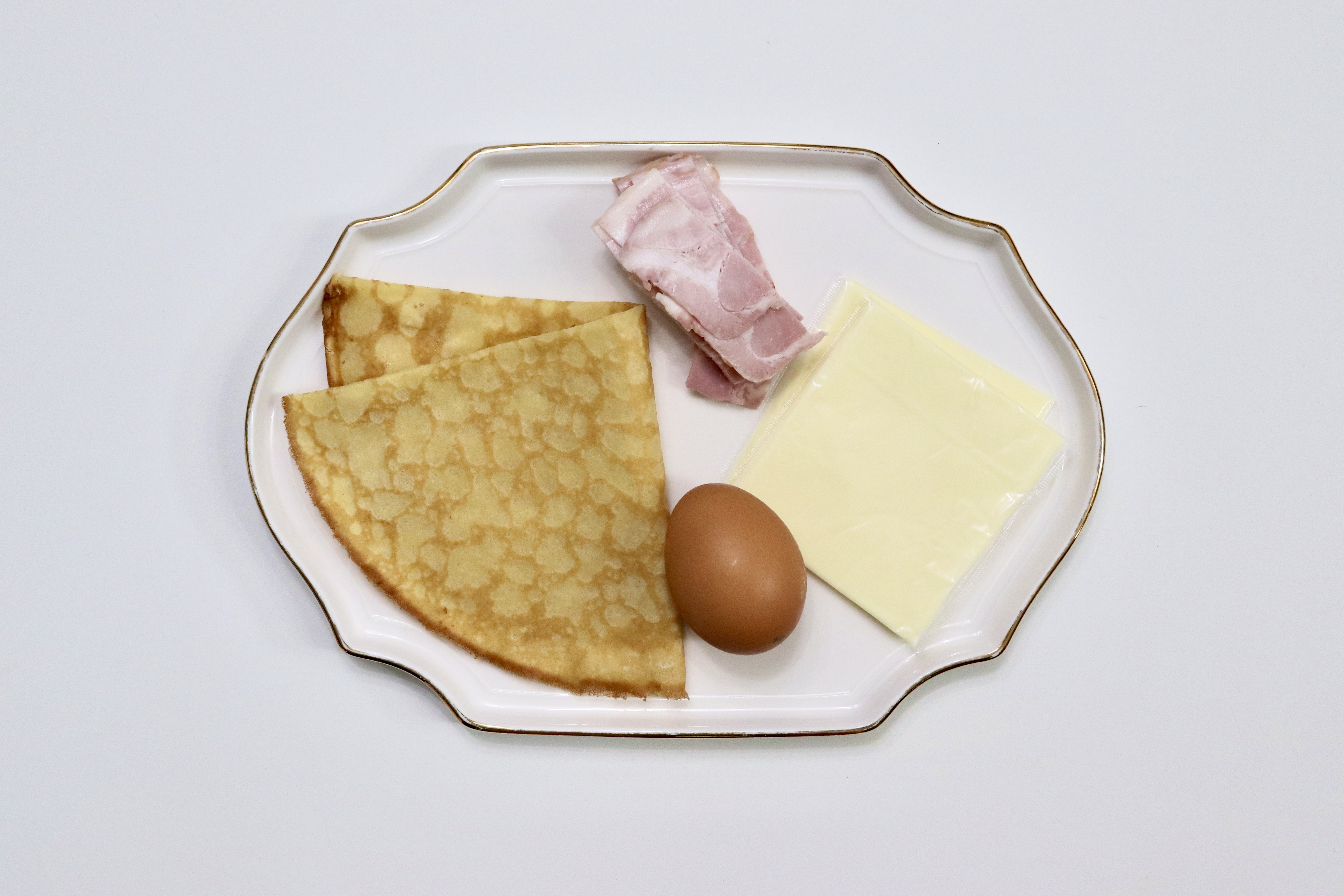 # 재료 : 크레페 1장, 베이컨 2줄, 달걀 1개, 슬라이스 치즈 2장