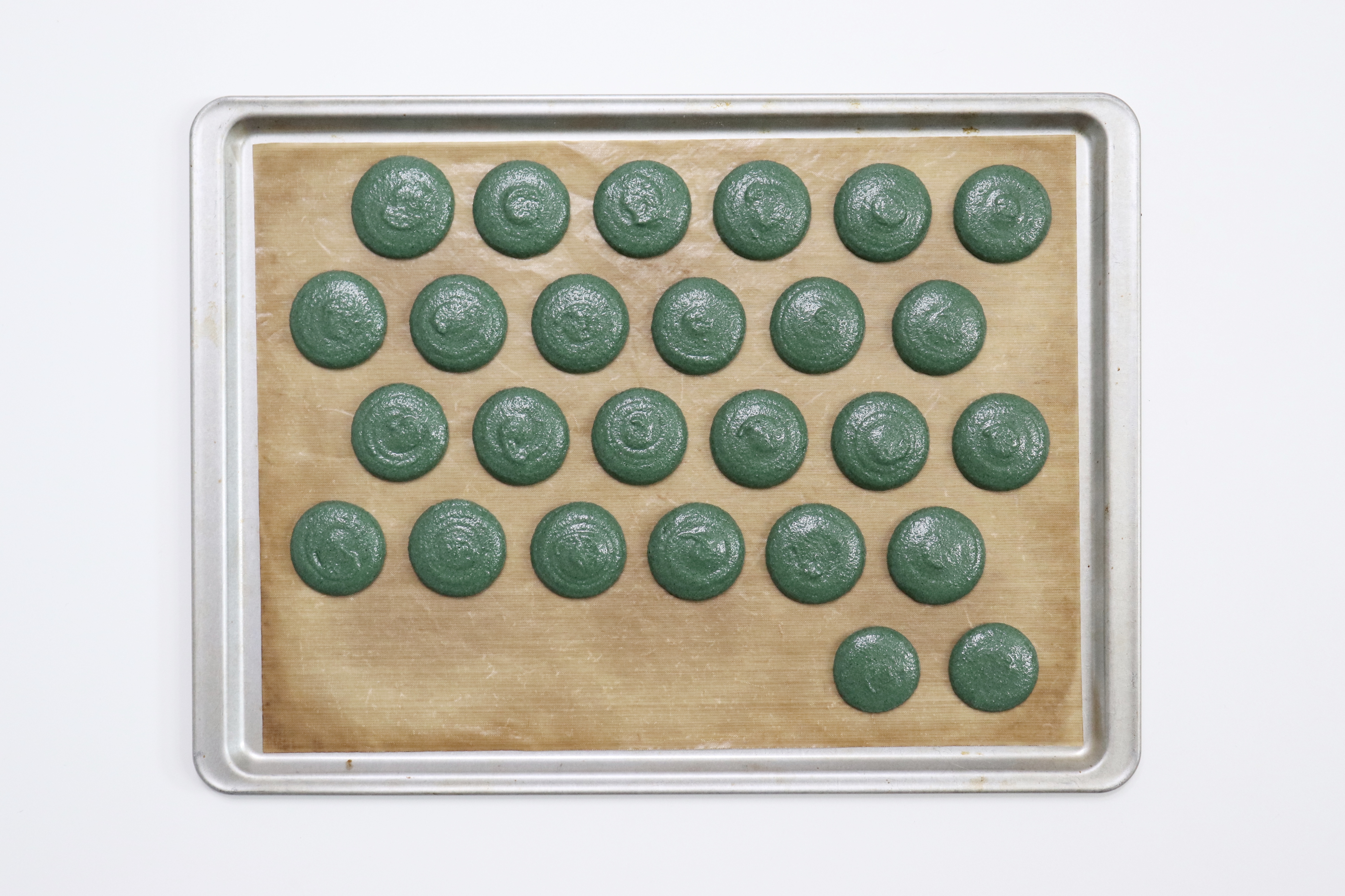 # 꼬끄 재료 : 흰자 70g, 설탕 60g, 아몬드 가루 95g, 슈거파우더 85g, 쑥가루 5g, 녹색 색소