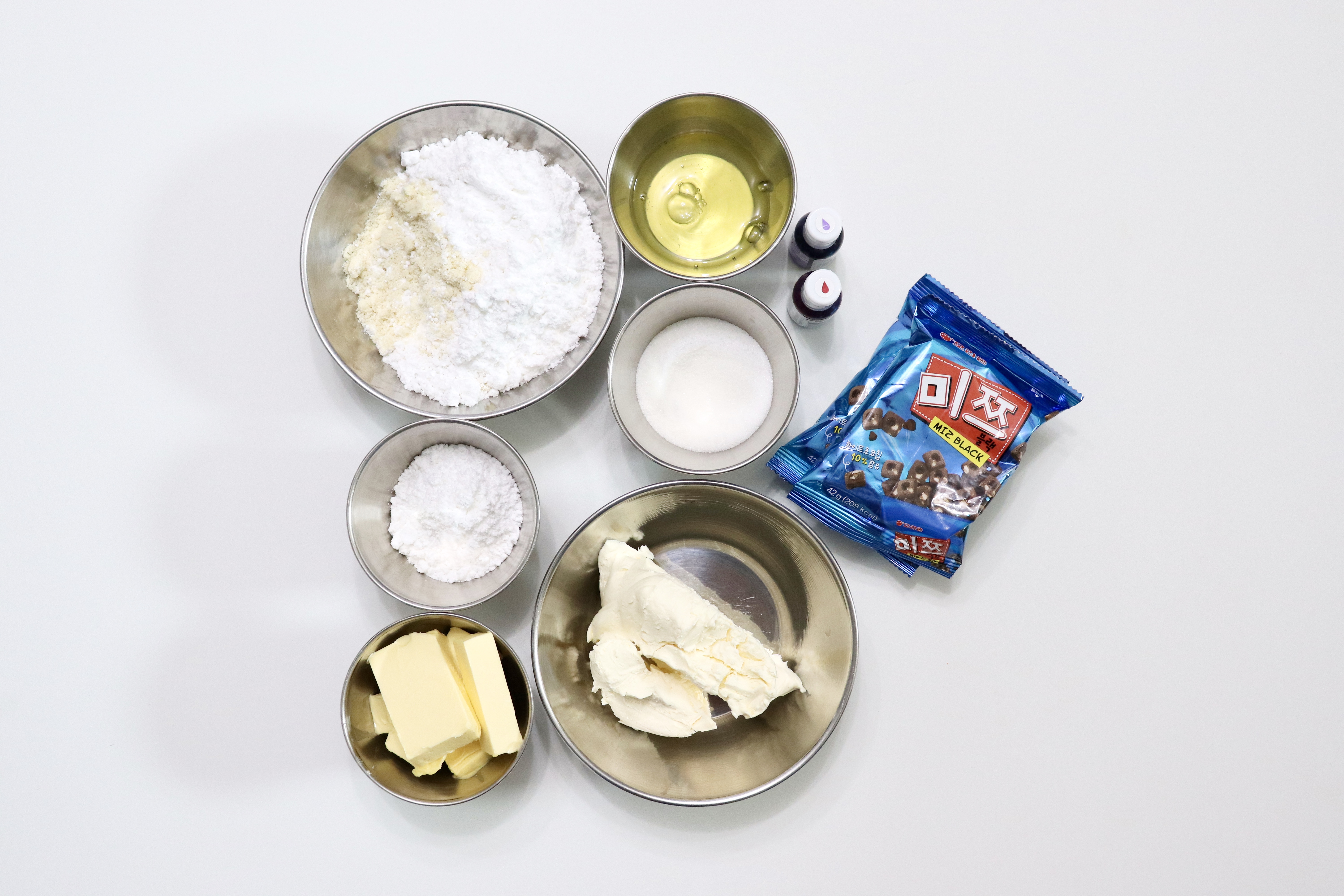 # 필링 재료 : 크림치즈 180g, 버터 120g, 슈거파우더 50g, 미쯔 42g(한 봉지)