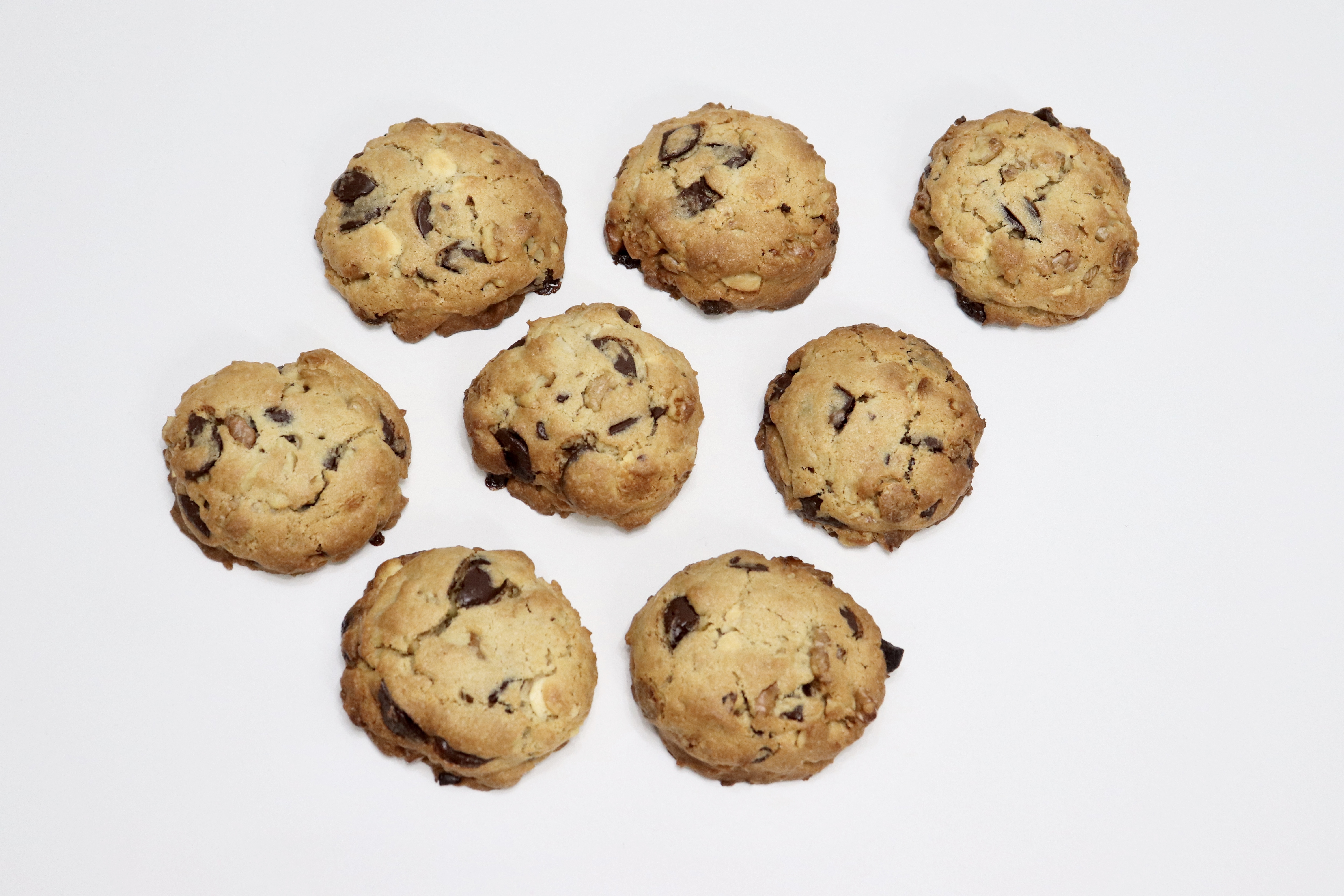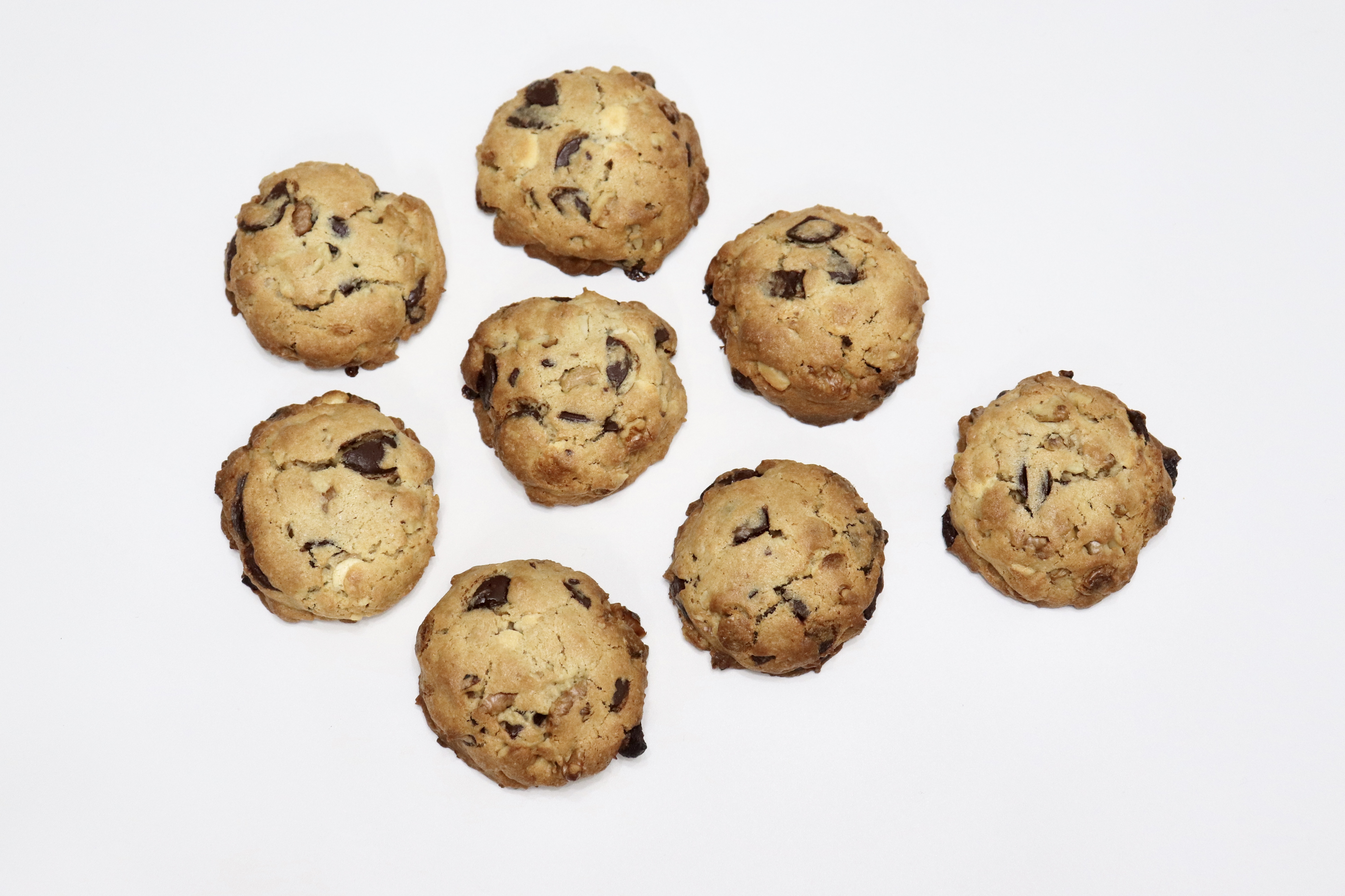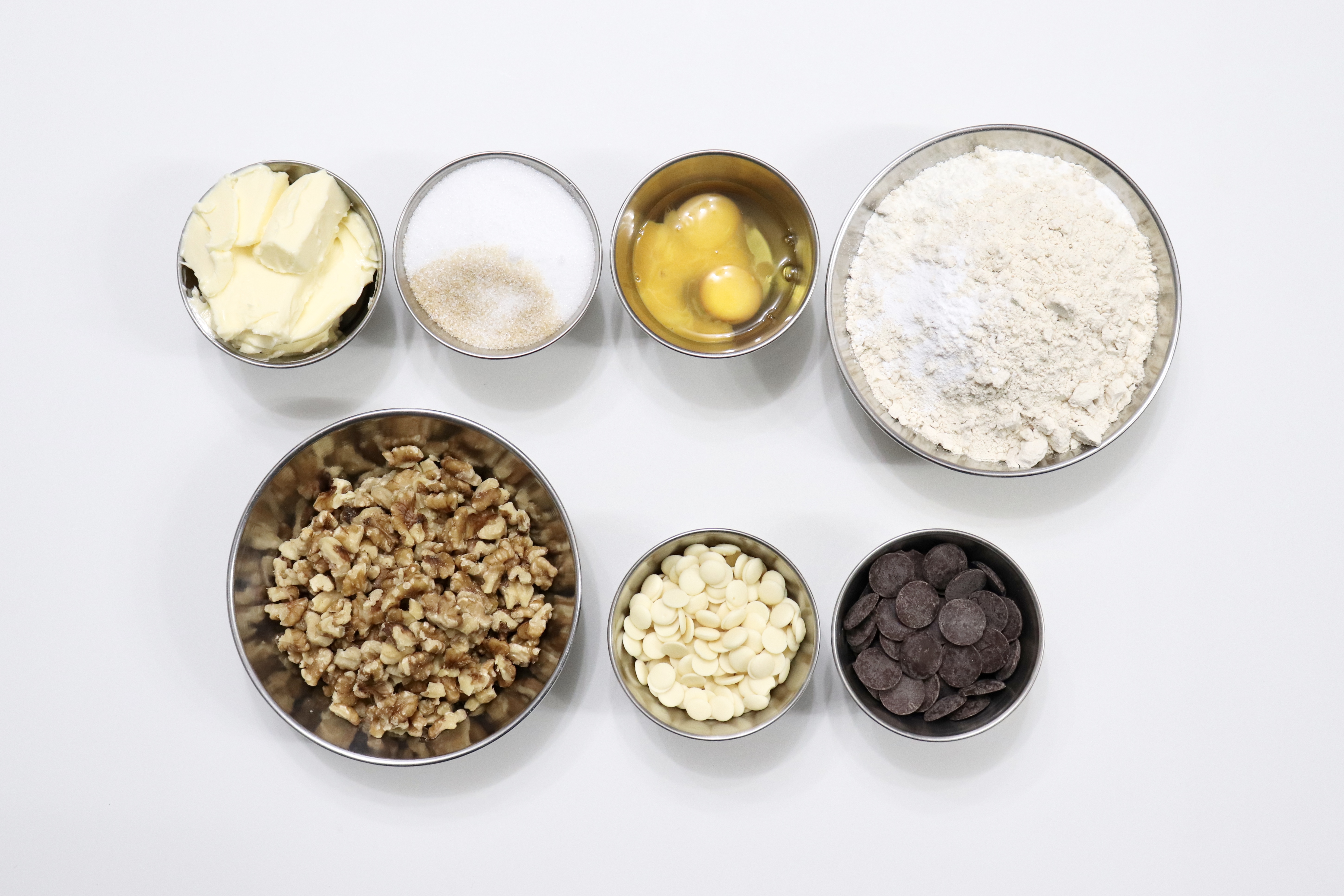 # 재료 : 버터 200g, 백설탕 100g, 갈색설탕 100g, 소금 한 꼬집, 달걀 110g, 바닐라오일 4~5방울, 통밀가루 130g, 중력분 200g, 베이킹파우더 4g, 베이킹소다 3g, 다크 커버춰 200g, 화이트 커버춰 120g, 호두 220g