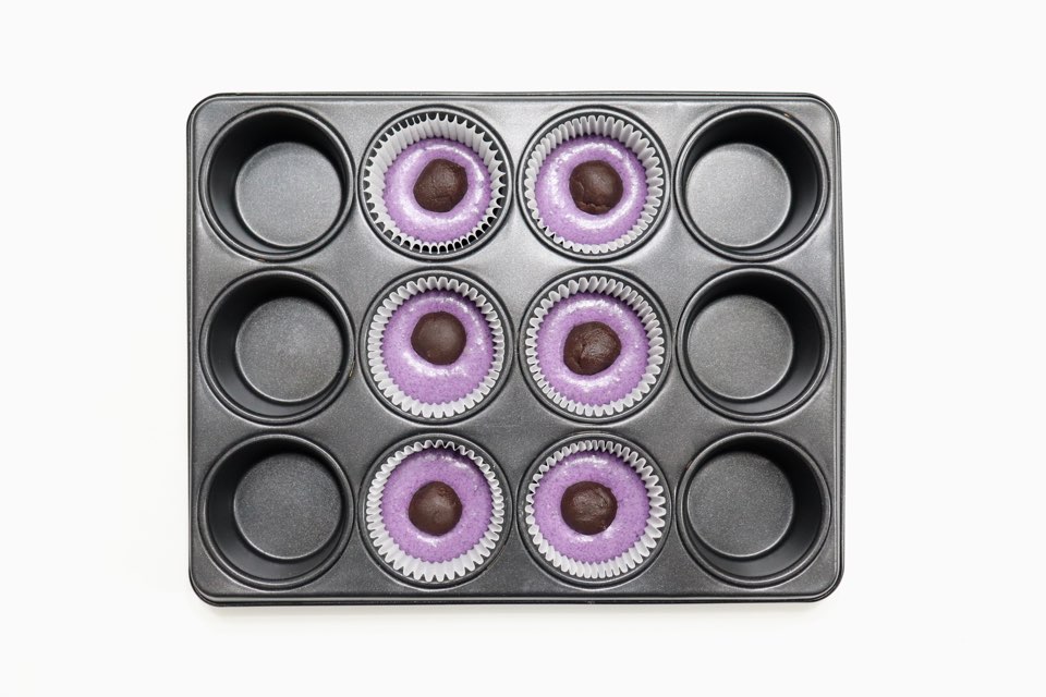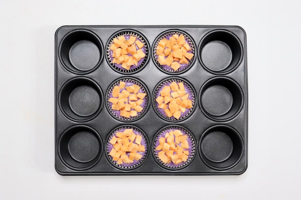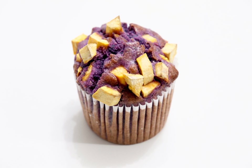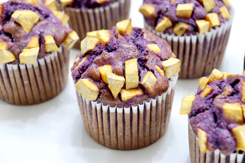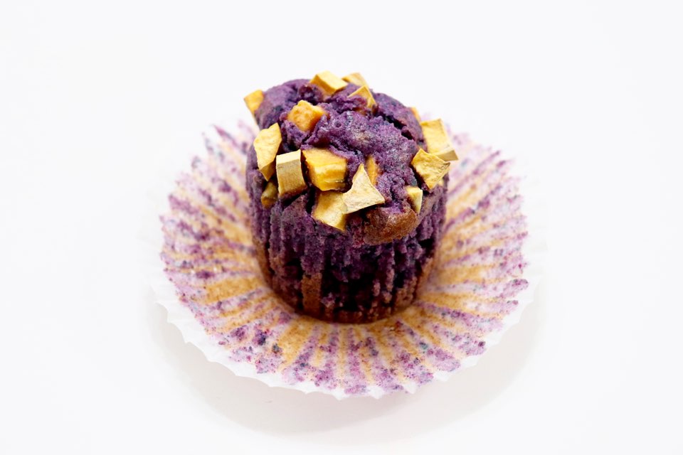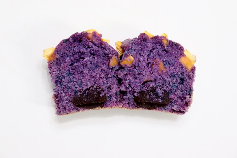 색소를 넣지 않아도 진한 보랏빛 머핀을 만들어낼 수 있는데요. 사진이 더욱 쨍하게 나와서 실제 완성품을 제대로 보여드릴 수 없어 아쉽네요. 팥앙금을 넣었지만 적당히 달달하고, 토핑으로 뿌린 고구마도 함께 잘 어우러져 맛있습니다.