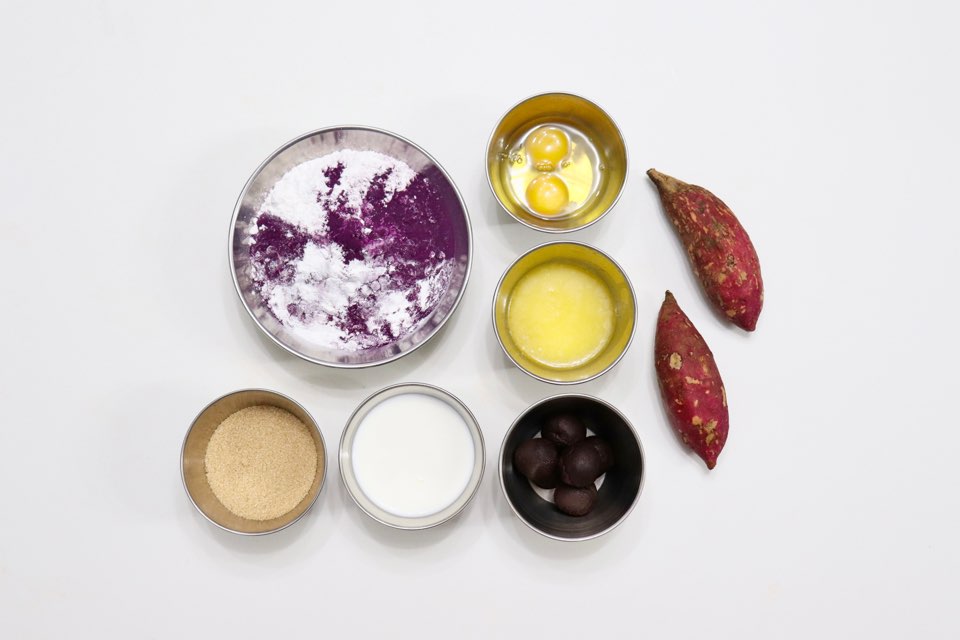# 재료 : 우유 160g, 갈색설탕 100g, 소금 한 꼬집, 달걀 100g, 버터 80g, 쌀 박력분 220g, 자색 고구마 가루 15g, 베이킹파우더 6g, 팥앙금 15g, 고구마 2개