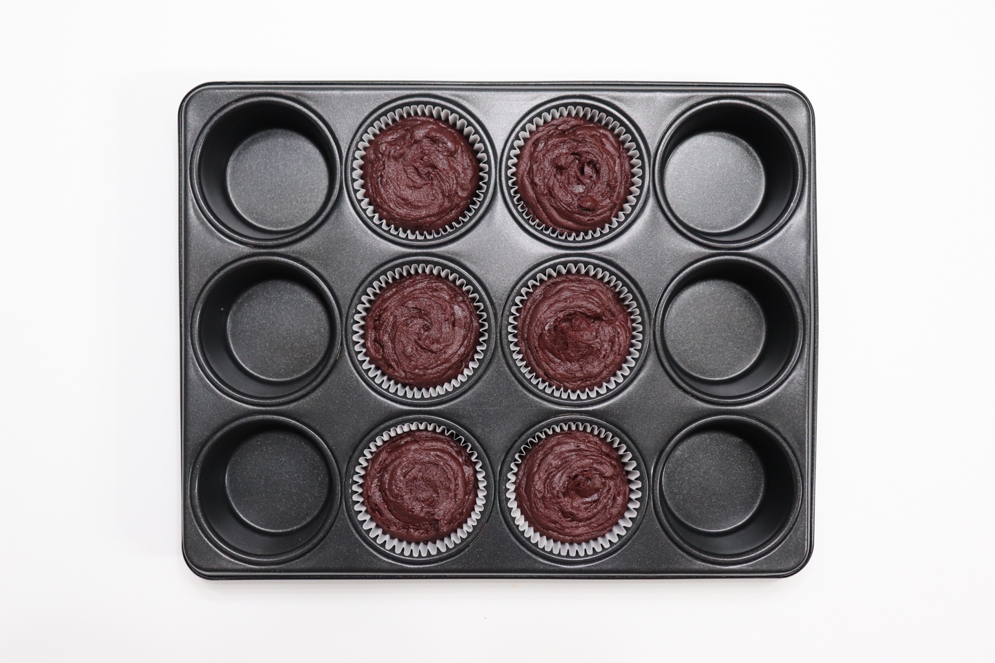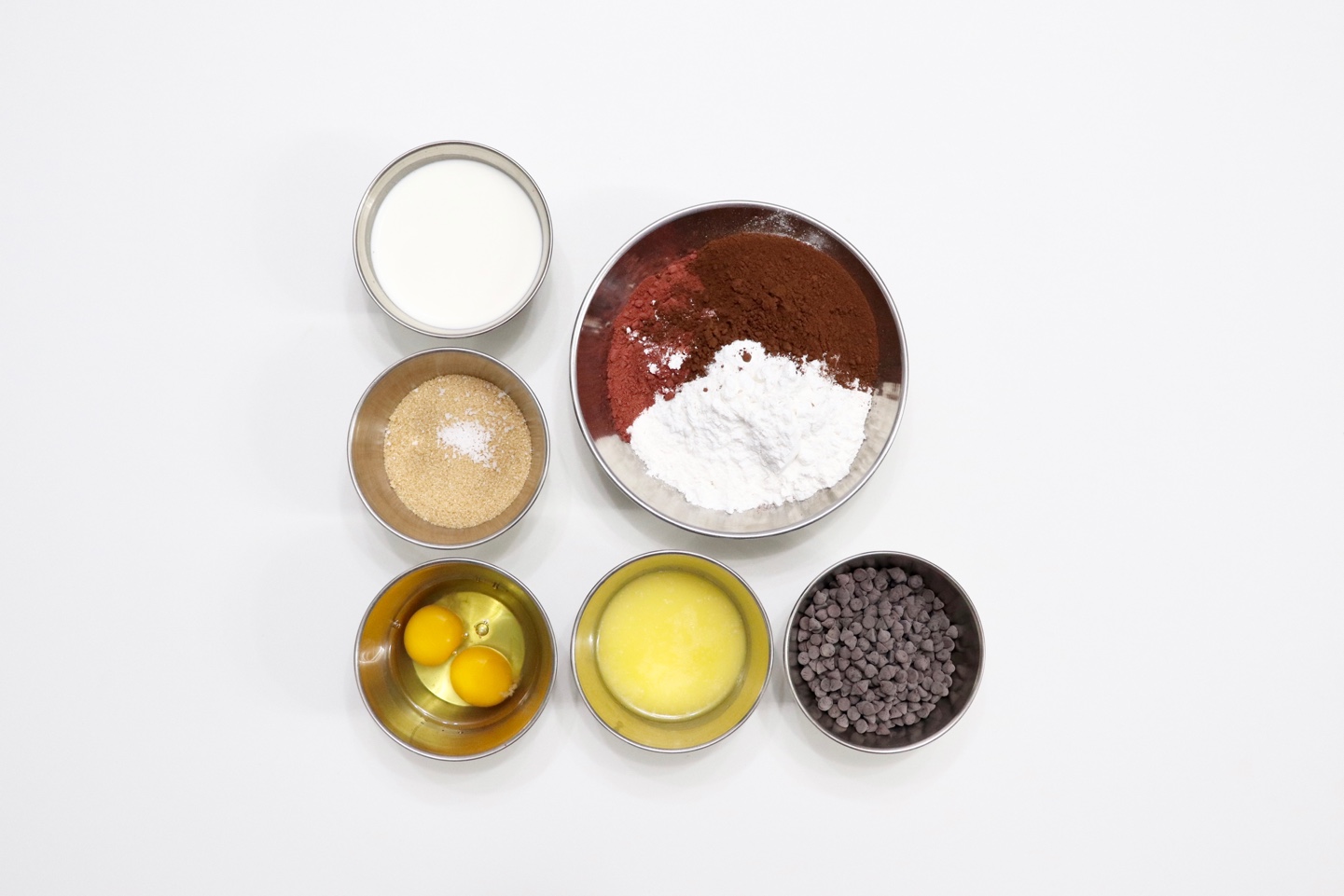 # 머핀 재료 : 우유 80g, 생크림 80g, 갈색설탕 100g, 소금 한 꼬집, 달걀 100g, 버터 80g, 쌀 박력분 120g, 홍국쌀가루 100g, 코코아 가루 15g, 베이킹파우더 6g, 초코칩 200g