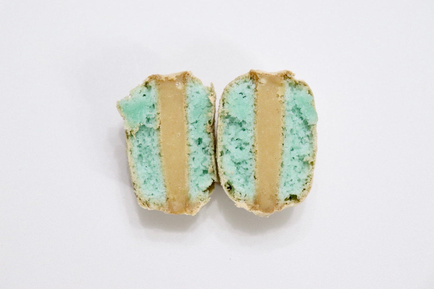 대두 고물을 넣어 만든 필링과 겉에 묻힌 가루들이 너무 과하지 않을까 싶었는데, 적당히 달달하면서 고소하니 새로운 맛의 마카롱이 완성된 것 같아요. 처음에 색소는 고민했었는데 은은한 하늘색, 민트색 빛 꼬끄가 반 쪼개어 봤을 때 예쁘고 대두 고물과 정말 잘 어울리는 것 같아요. 색소 없이 하셔도 예쁠 것 같고, 가운데 빙수떡 등을 넣어주셔도 더 맛있고 재밌는 식감을 줄 수 있을 것 같아요. 대두 고물이 없으시면 미숫가루를 활용하셔서 만들어보시면 좋을 것 같습니다 :-)