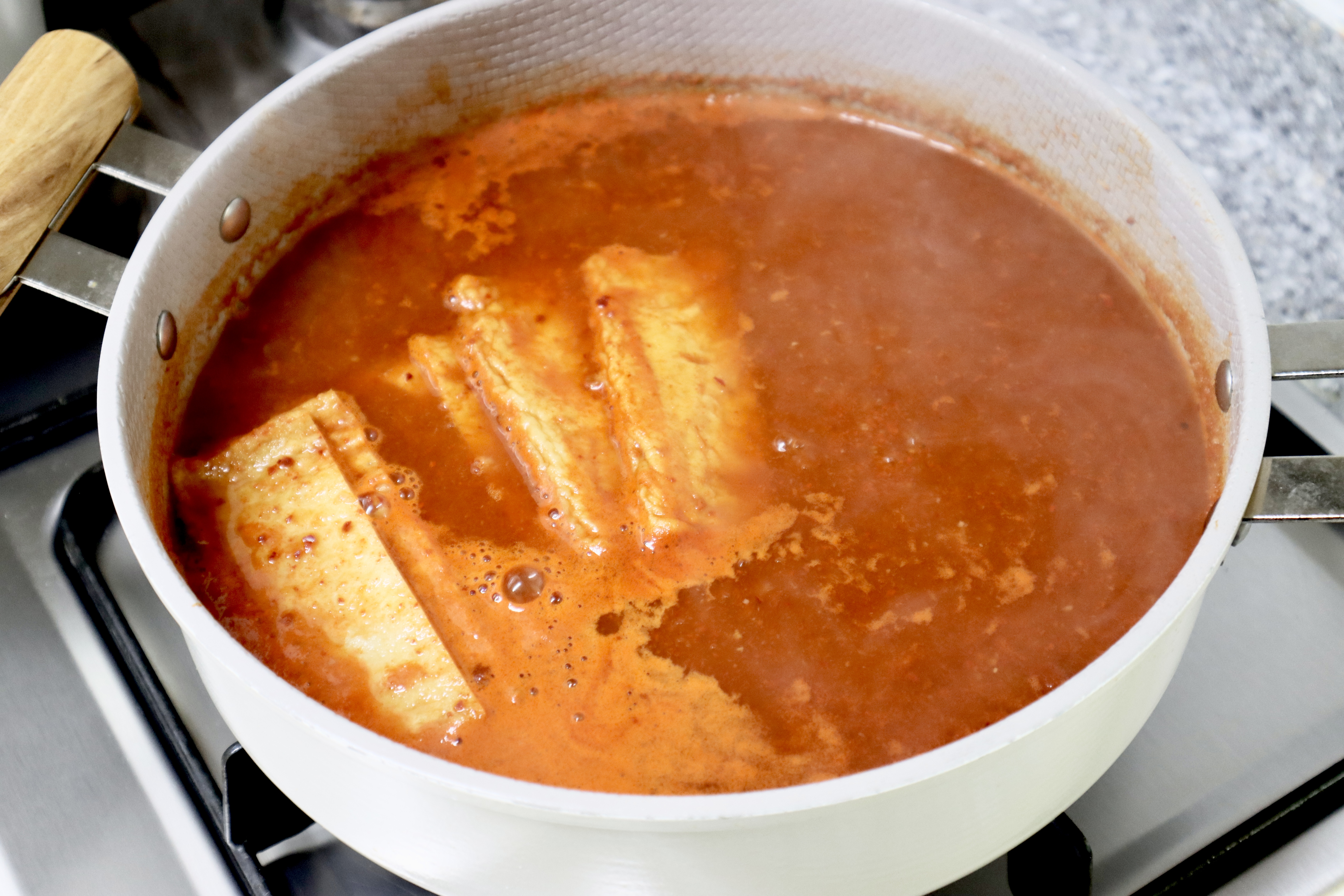 보글보글, 맛있어 보이죠? 여기에서 맛을 완성 시키는 재료는 카레가루와 치킨스톡 가루예요. 특히 카레는 너무 많이 들어가면 카레맛이 나버려서 애매한 떡볶이가 되어버리죠. 조금씩 넣어가며 맛을 보고 가감해주세요. 감칠맛이 확 살아날 거예요~