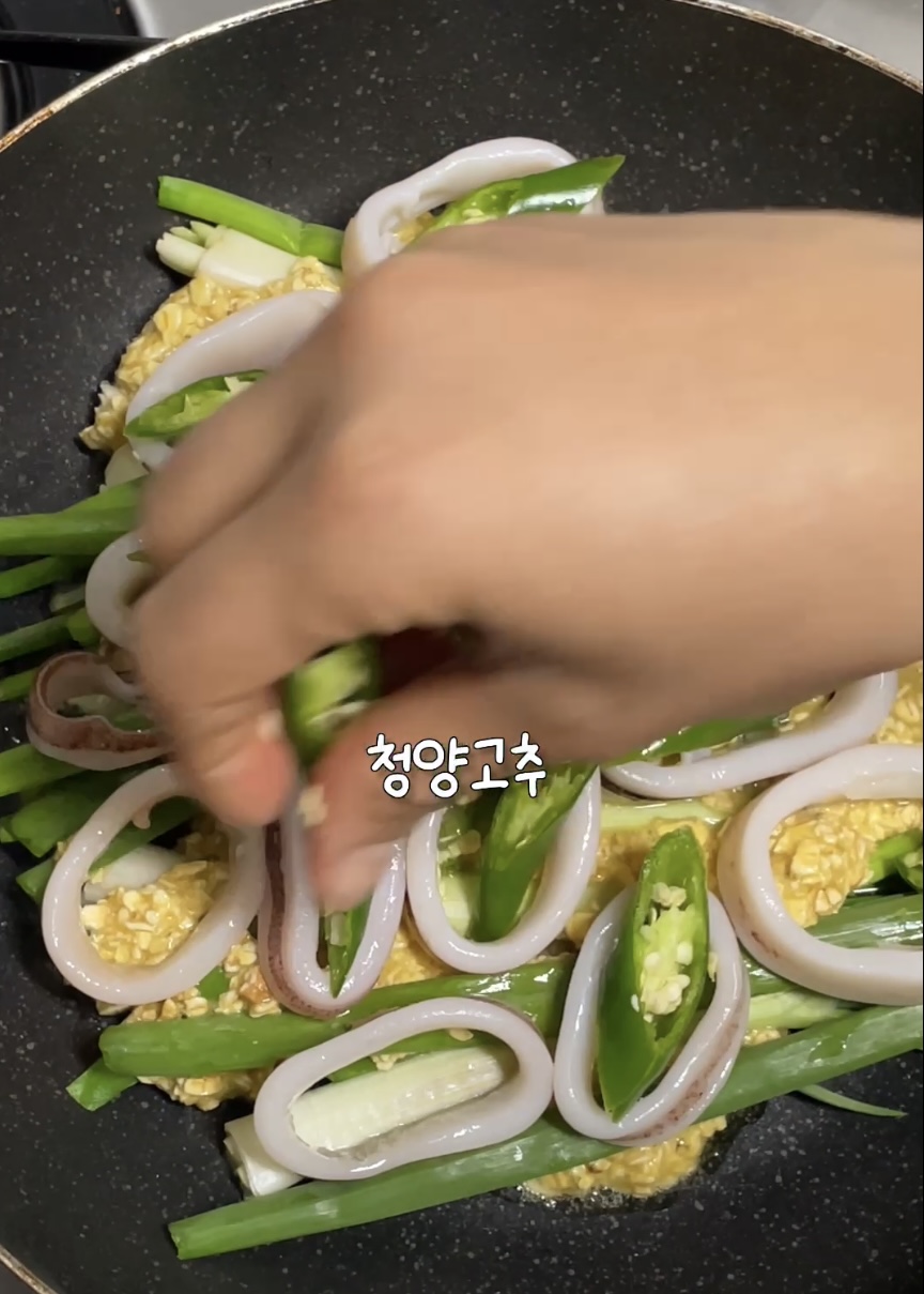 3. 다시 오트밀 계란 반죽을 올려 잘 펴고, 오징어와 청양고추를 올려주세요