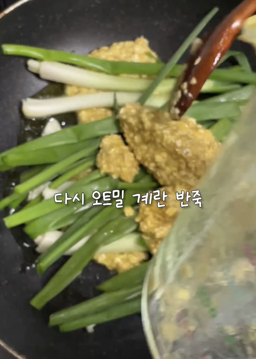 2. 프라이팬에 기름둘러 오트밀 계란 반죽을 펴고, 쪽파를 올려주세요