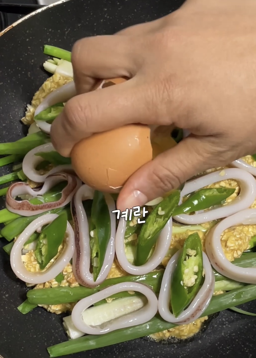 재료: 계란 2개, 미림 2T, 참치액 1T, 오트밀 1컵, 쪽파, 오징어, 청양고추
