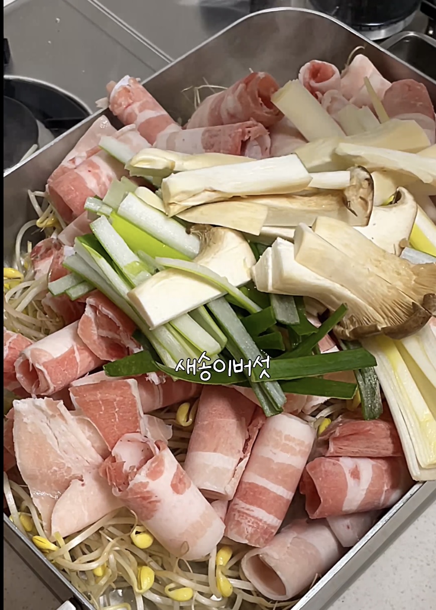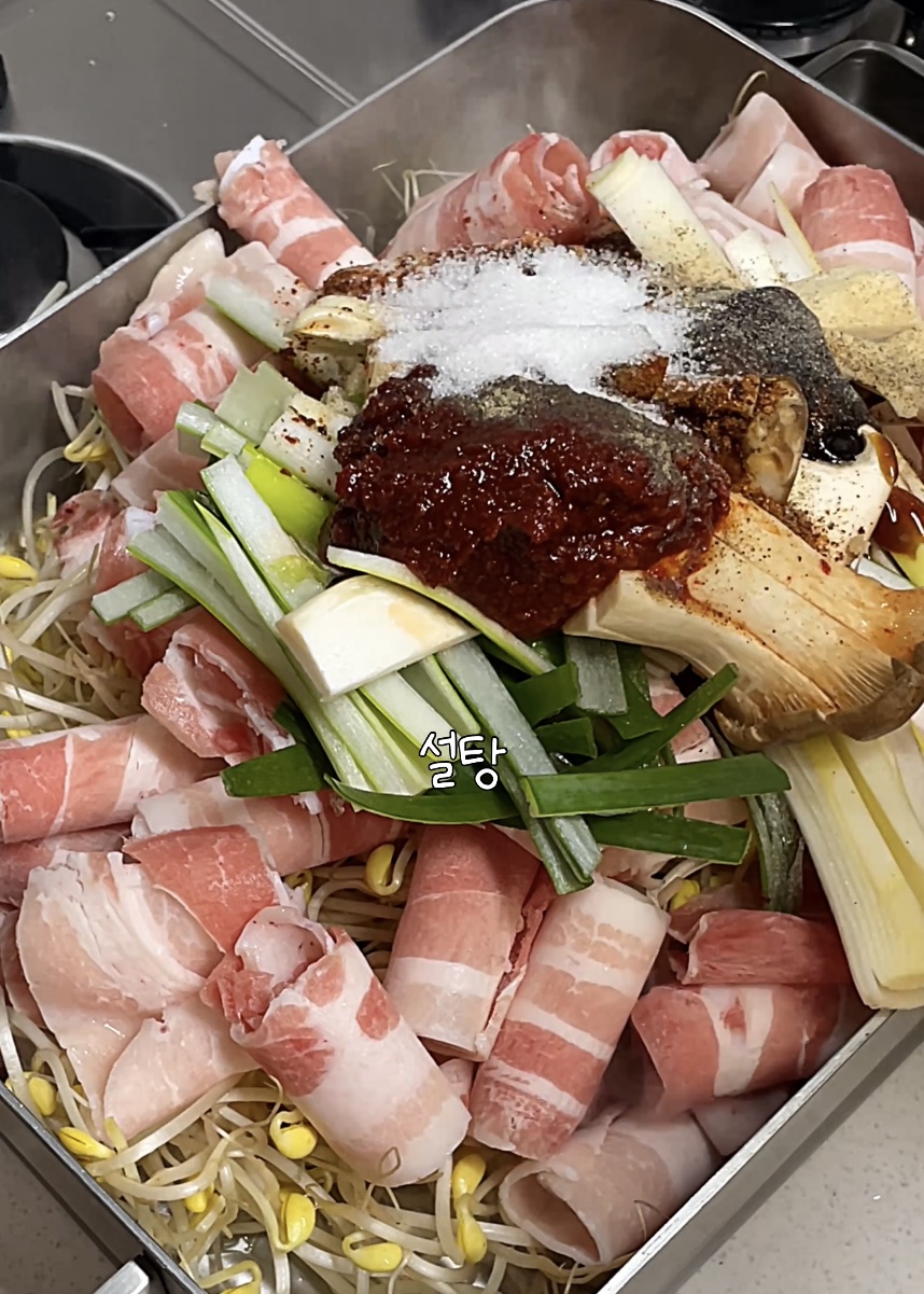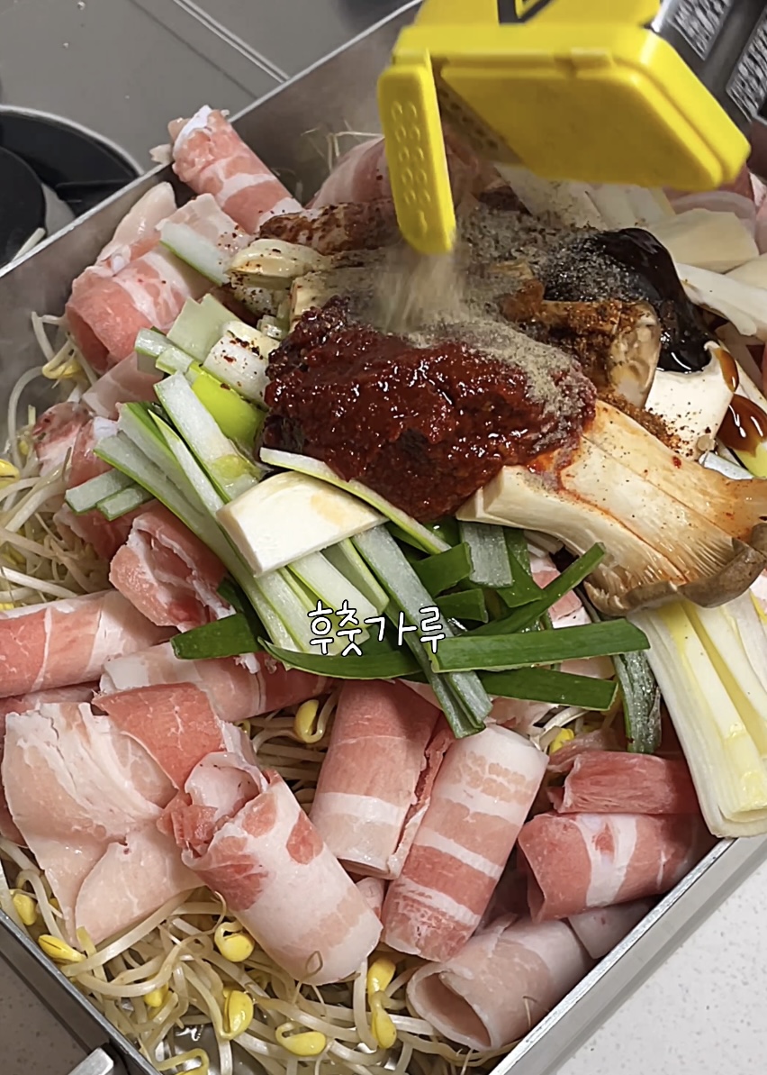 재료: 콩나물 500g, 대패 삼겹살 700g, 대파 한 단, 새송이 버섯 1개, 고추장 3T, 고춧가루 3T, 간장 2T, 굴소스 1T, 미림 2T, 참치액 1T, 후춧가루, 설탕 3T, 캡사이신, 다진 마늘