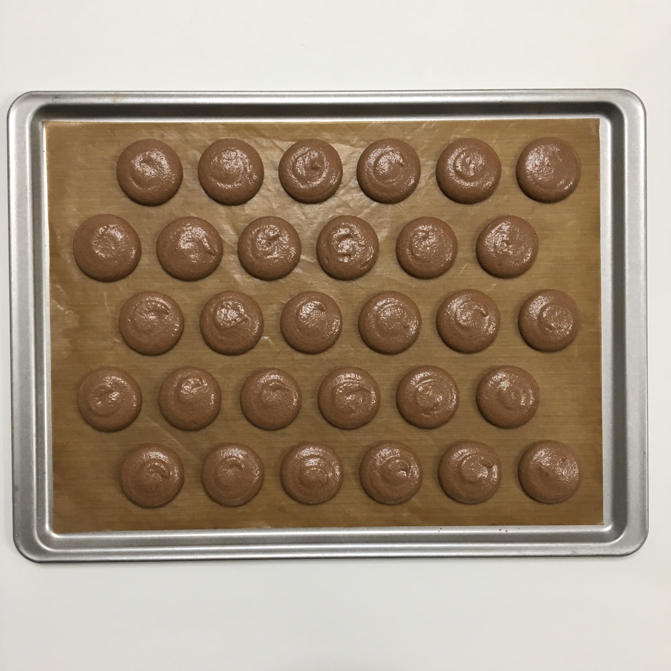 반죽에 되기를 맞춰가며 공기를 빼주는 작업인데요. 너무 과하면 퍼져서 모양 잡기가 힘들고, 덜하면 속이 빈 마카롱이 될 확률이 높다고 합니다. 반죽을 폈다 모았다 하면 반죽에 윤기가 나고, 반죽을 위로 들어 떨어뜨려봤을 때 자국이 사라지려고 하는 정도에서 멈춰주는 것이 적당한 것 같습니다.