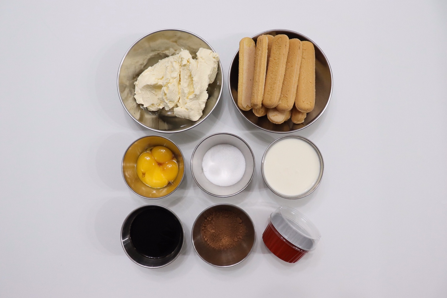 # 재료 : 노른자 4개, 바닐라 오일 4~5방울, 설탕 50g, 소금 한 꼬집, 크림치즈 250g, 생크림 200g, 사보이아르디 쿠키 24개, 커피 원액 200ml, 코코아 가루