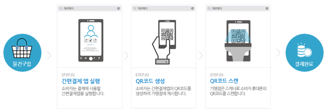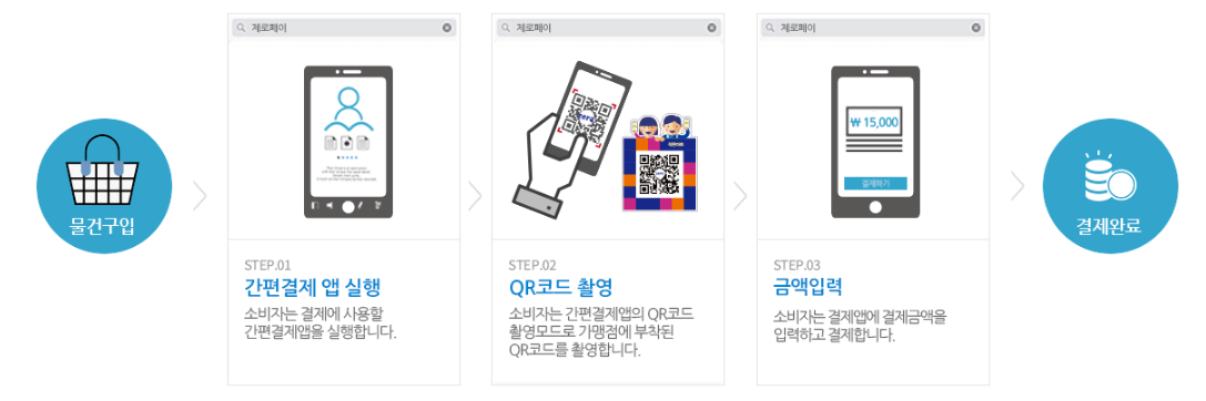 1. 소비자 휴대폰의 간편 결제 앱으로 가맹점에 부착된 QR코드를 촬영