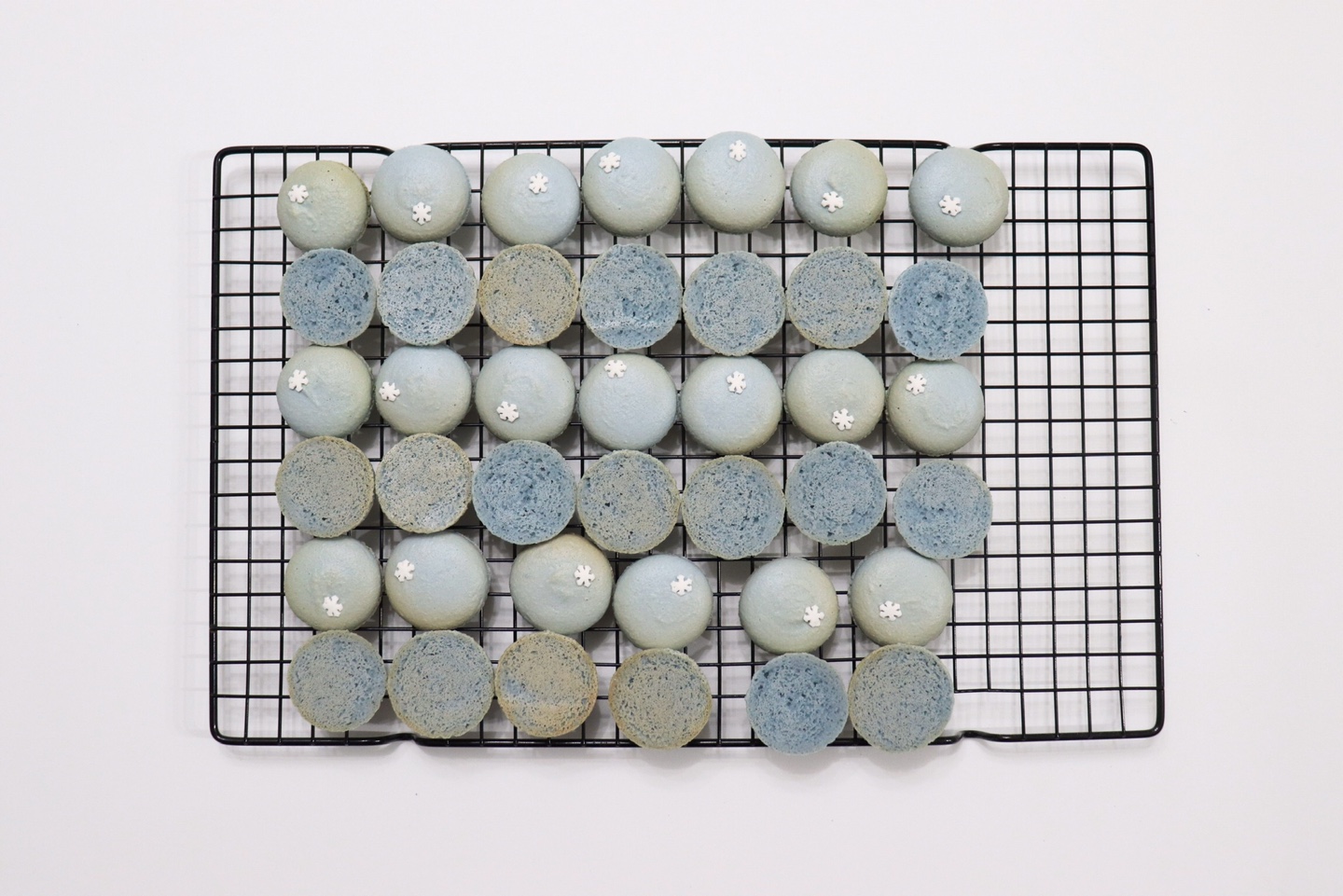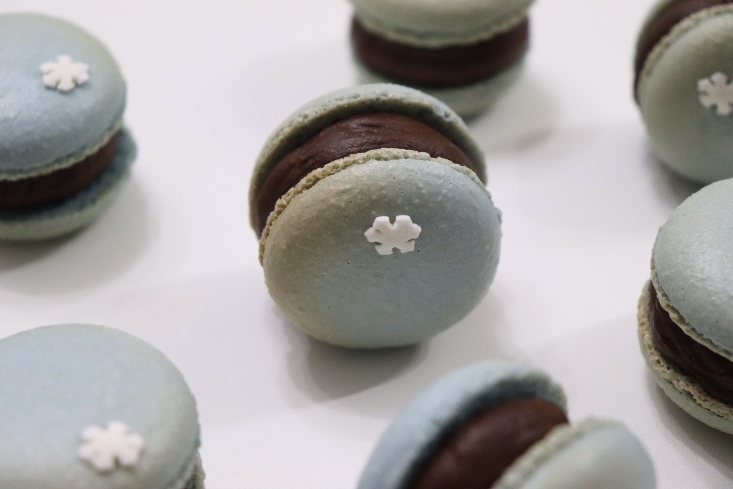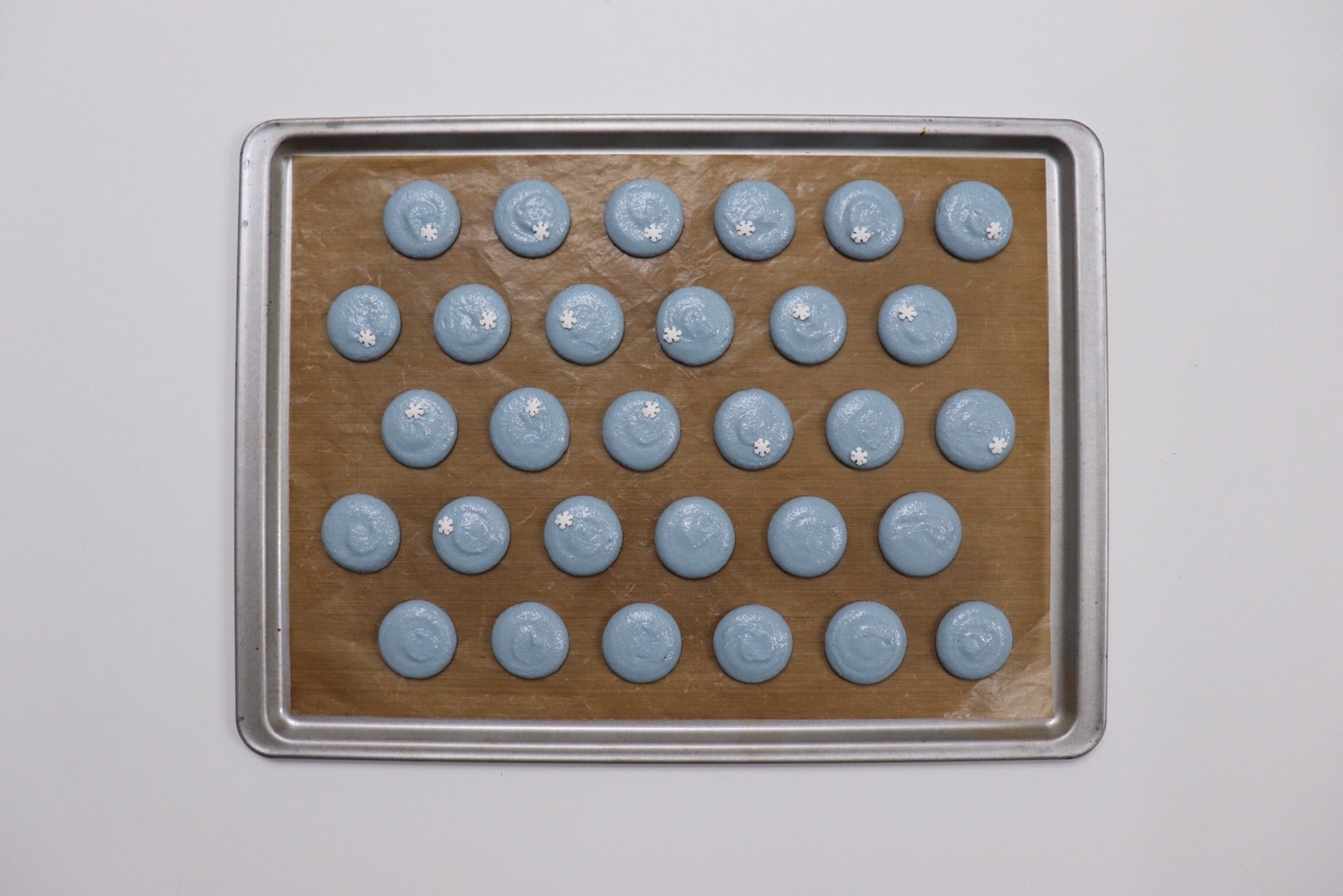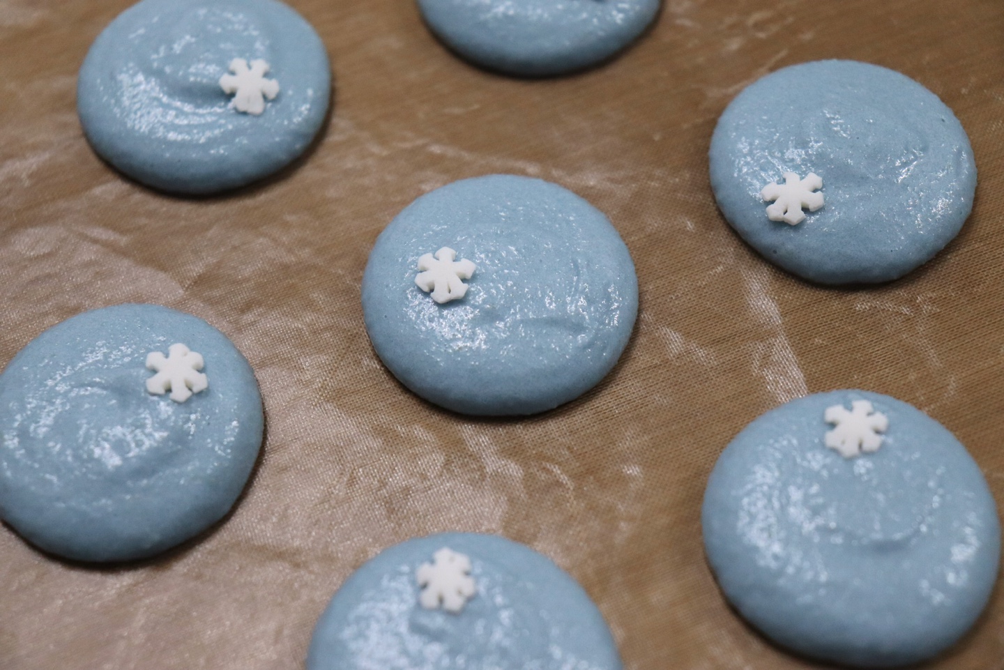 빨리 눈을 만나고 싶은 마음에, 파란색 꼬끄에 눈꽃 스프링클을 올려 마카롱을 만들었는데 제대로 만들었는지 다들 겨울왕국이 생각난다고 했죠.