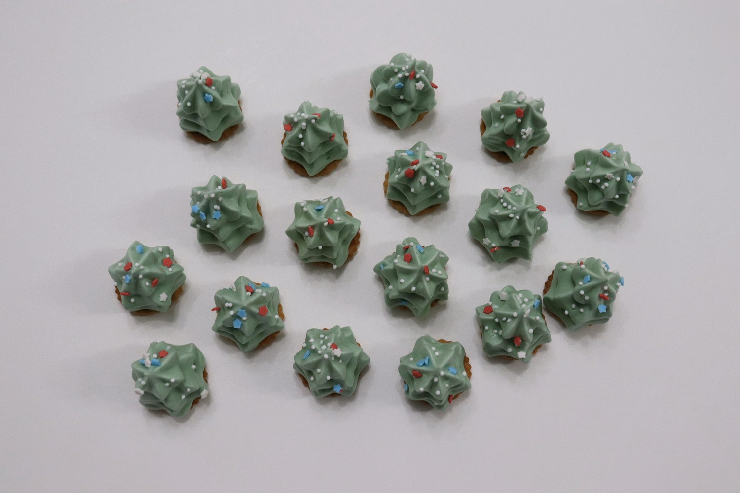 눈이 내린 나무를 표현하고 싶어서 흰색 스프링클을 뿌려줬어요. 전구를 걸어 반짝거리는 트리를 표현하고 싶어서 빨간색과 파란색 별을 살짝 올렸고요. 트리처럼 예뻐 보이나요?^^