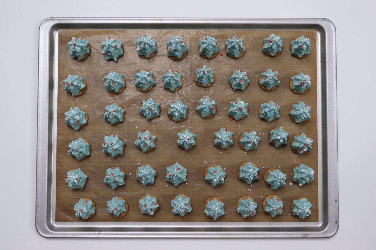 # 재료 : 달걀흰자 90g, 백설탕 90g, 바닐라오일 2~3방울, 녹색 색소, 감자 크래커 45개, 스프링클, 색소